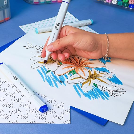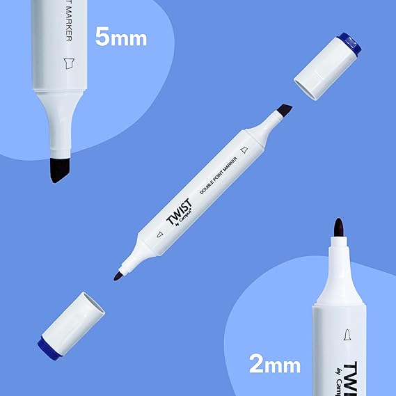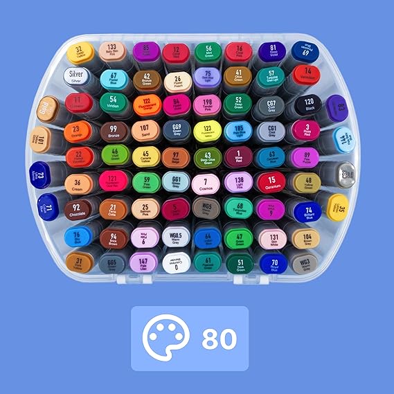 Marcadores de alcool coloridos de ponta dupla. Com a ponta fina, desenhe linhas suaves e precisas. Com a ponta grossa e chanfrada, pinte e sublinhe áreas maiores. Cores brilhantes e pigmentadas, resistentes à luz e ao sol. Apresentado em estojo plástico transparente com alça e fecho, perfeito para levar para qualquer lugar.