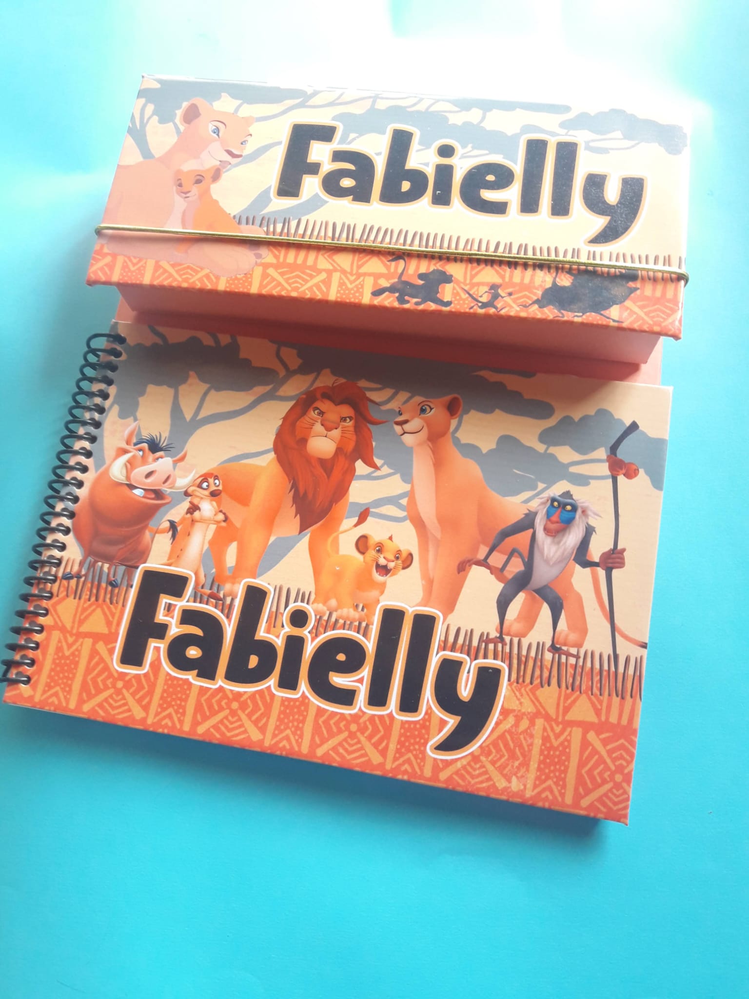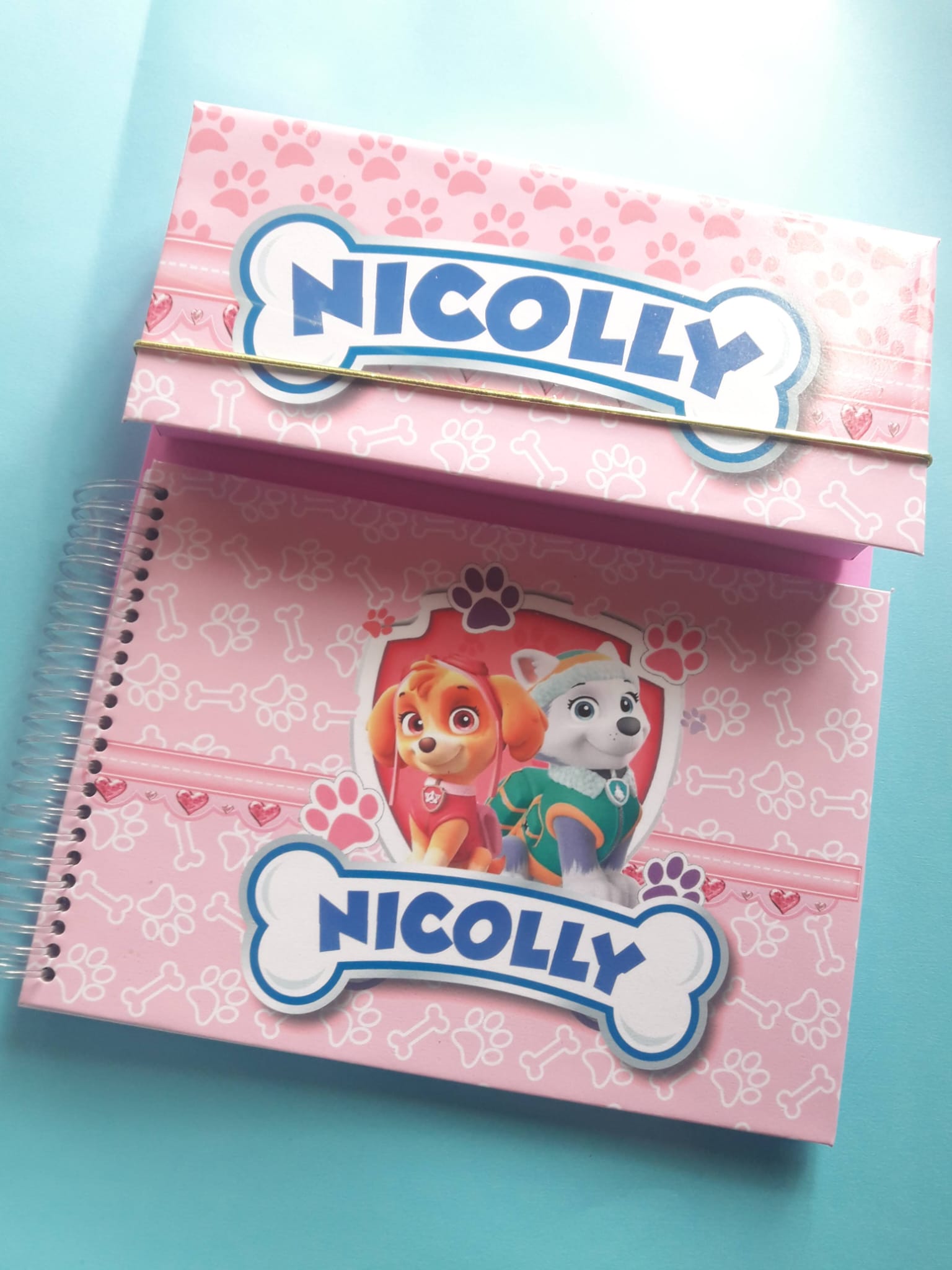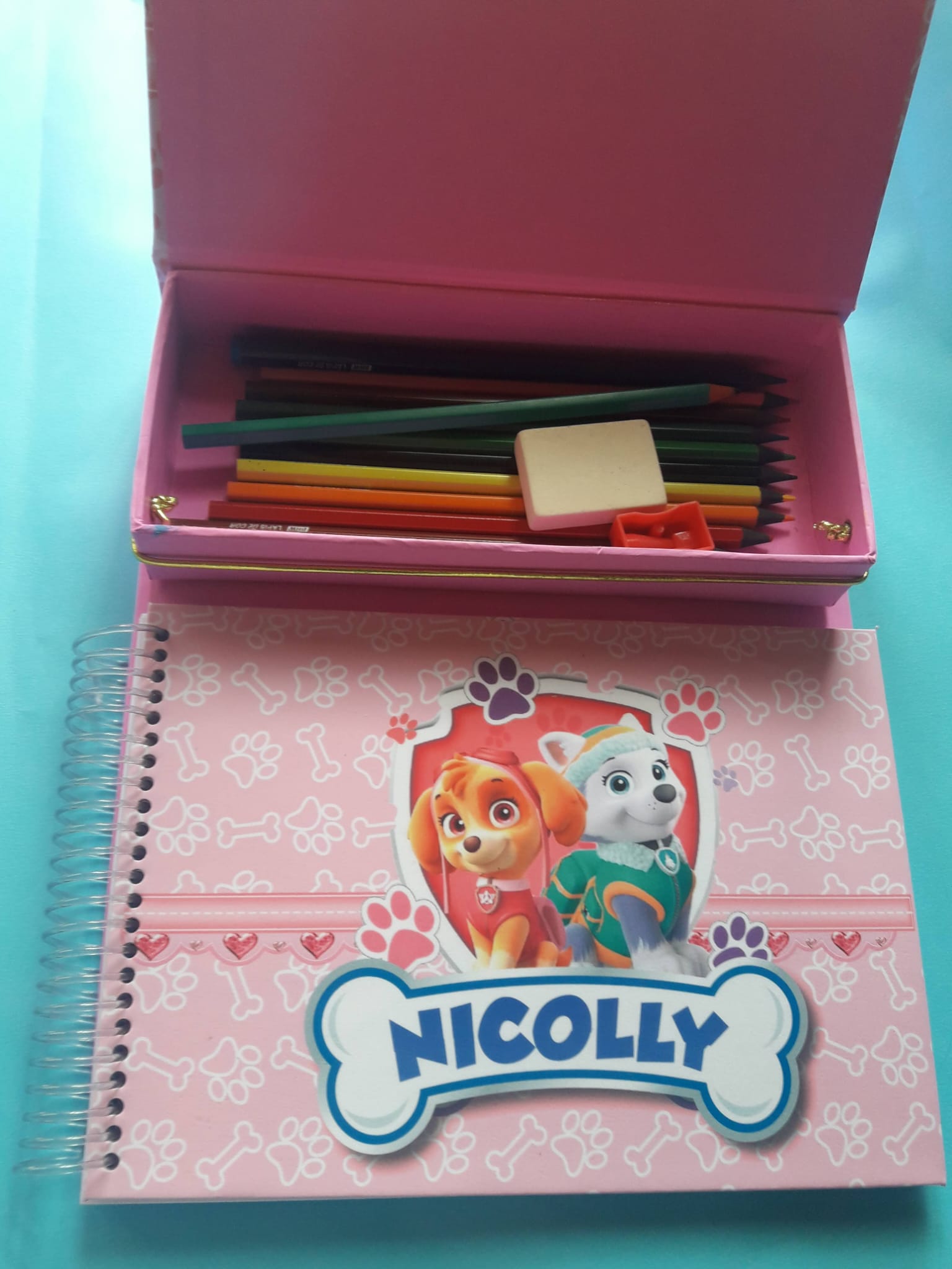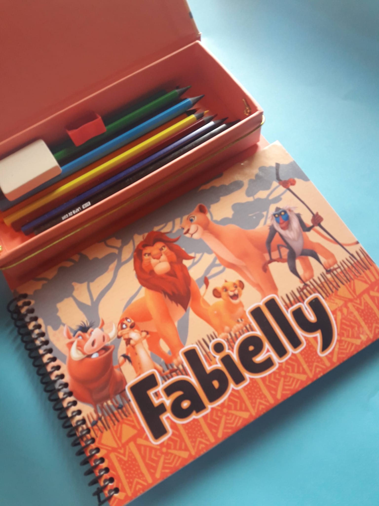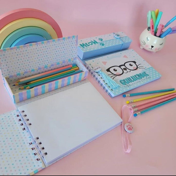 Acompanha: Base cartonada, Caderno tamanho A5 com 60 folhas (fixo na base) e Estojo com 12 Lápis de Cor (fixo na base).